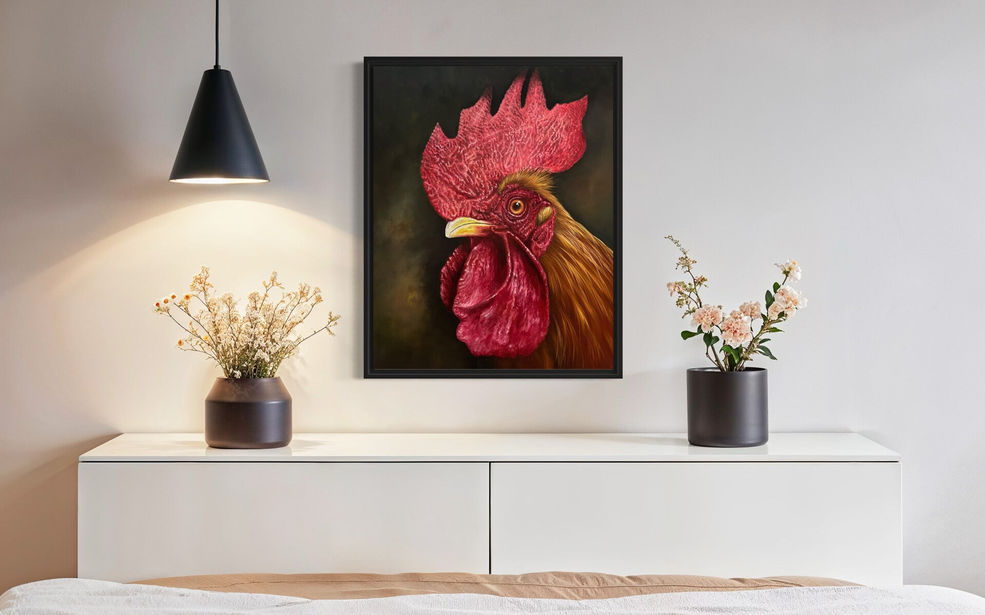 I painted this oil portrait of the rooster Hendrik with great attention to his proud appearance. His large red comb and full wattles immediately catch the eye, while the rusty brown and orange feathers bring warmth and depth. In the dark background, the same play of colors subtly reappears, making Hendrik shine even more.